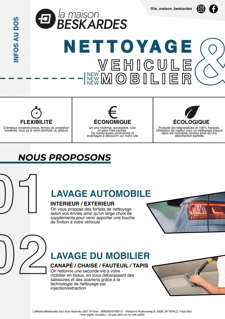 J’ai donc dû réaliser les premières impressions du client afin de lancer sa prospection. En respectant le brief, il était nécessaire que le visuel soit moderne, que les informations soient clairement visibles, tout en mettant en avant son nouveau concept de nettoyage de mobilier.
